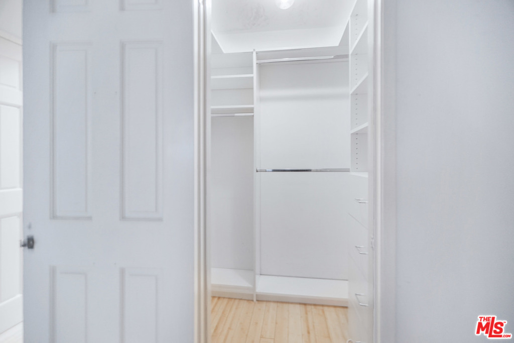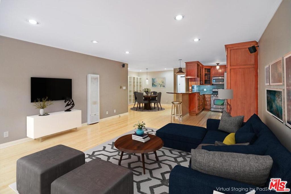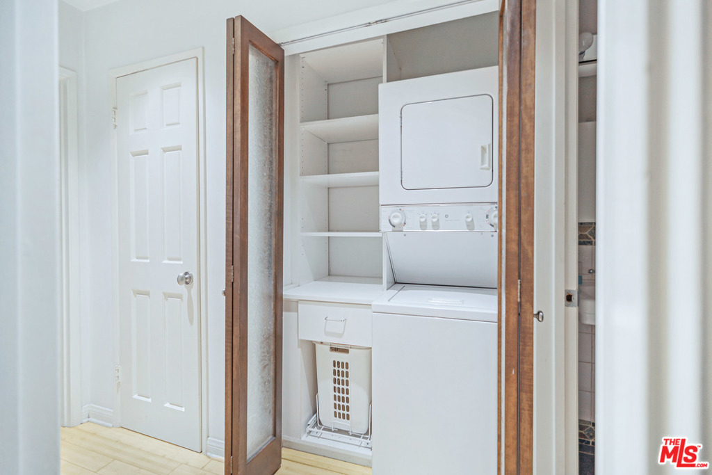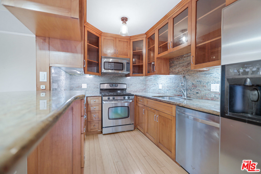 Introducing this beautiful, spacious, and upgraded one bedroom ground floor condo. This charming unit features beautiful hardwood floors throughout, bright recessed lighting, surround speakers, marble kitchen counters & breakfast bar, stainless steel appliances, plenty of kitchen storage, convenient in-unit stackable laundry, a peaceful & private Master Bedroom with a walk-in closet and built-in organization. Additionally, the unit offers a serene private patio and convenience to the parking space and main entrance. The parking spot comes with additional storage. Very walkable location. One block from LA Fitness, Close to Metrolink Station, Whole Foods, Trader Joes, Target, Best Buy and so much more shopping & restaurants right next door in Brentwood and Santa Monica. Plus the home is only minutes away from Santa Monica Beach, Santa Monica City College, and UCLA. The best of what Los Angeles has to offer is all with 20 minutes or less. Very low HOA! It's a MUST SEE!