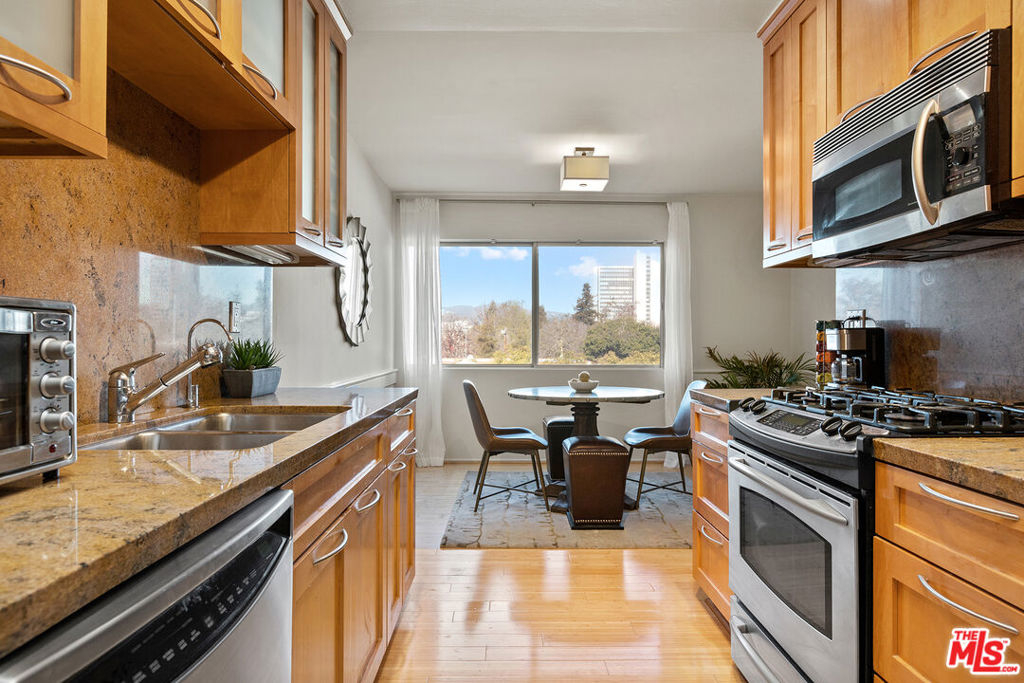 Fantastic two bed, two bath Penthouse on a quiet cul-de-sac in Westwood. This view property has bamboo floors, a generous kitchen with granite countertops and stainless steel appliances, and spectacular views of the sky and mountains. The master bedroom is bright and has a massive walk-in closet. The master bath has beautiful marble countertops, separate shower stall with a bench and skylight. The second bedroom is spacious and bright with a large custom closet. The building has gorgeous landscaping and a sparkling pool. All of this is within walking distance to Westwood Park and UCLA.