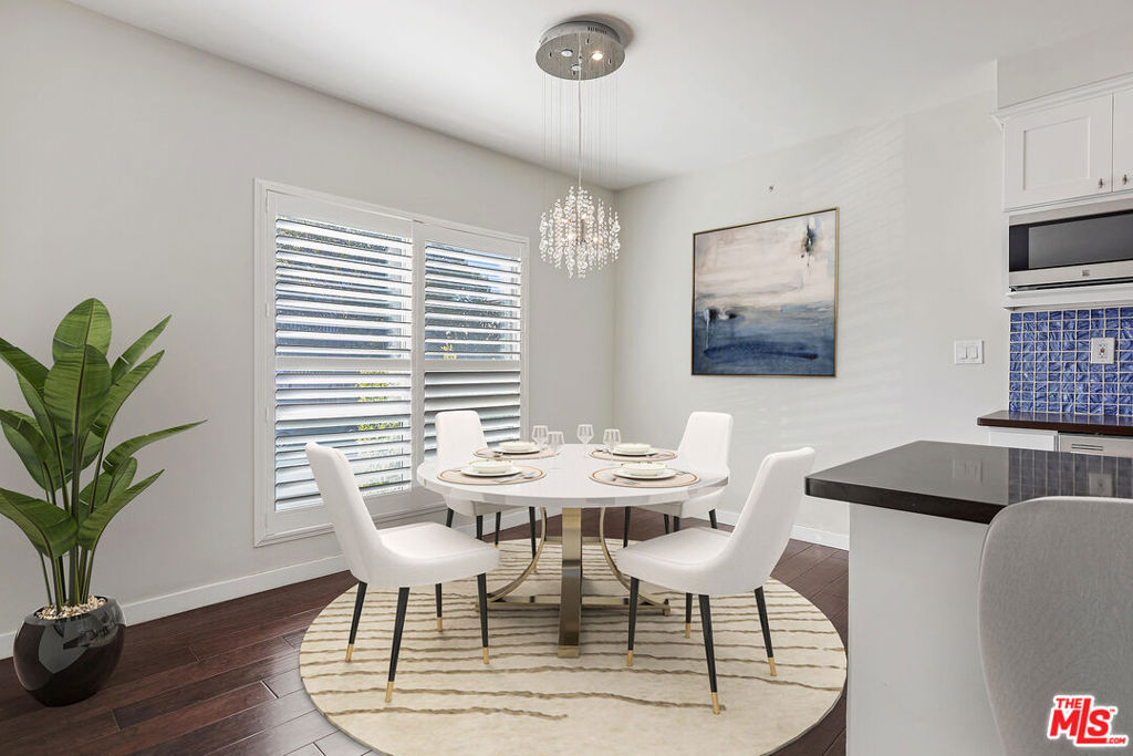 This immaculate bright unit is located in a desirable building on a tree-lined street, just north of Santa Monica Boulevard and minutes to the ocean. Enter to find an open floor plan with dark wide-plank wood floors that flow from the formal living room with modern fireplace to the kitchen with bar seating, delightful blue tile backsplash, white cabinetry, stainless-steel appliances, cooktop with hood, and tasteful decorative light fixtures dangling from above. The nearby dining area is illuminated by a glistening on-trend chandelier. The front balcony can be accessed through sliding glass doors for relaxing or dining al-fresco. Floor-to-ceiling shutters add to the charm of the home. The primary suite features a bathroom with floating dual-sink vanity, shower, and extra closet space including walk-in closet with built-ins. There is a secondary bedroom and bathroom with tub/shower combo, and a third bedroom also has a walk-in closet. Stacked laundry is in unit, and the building has secured-access subterranean parking with two tandem parking spaces. Just across the street, your new neighborhood Starbucks can be found. Welcome to this great Brentwood/Santa Monica-adjacent location near parks and schools just moments to shops, dining, nightlife, beaches, and the 405 and 10 Freeways.