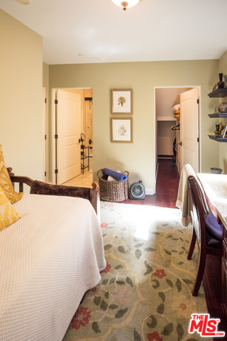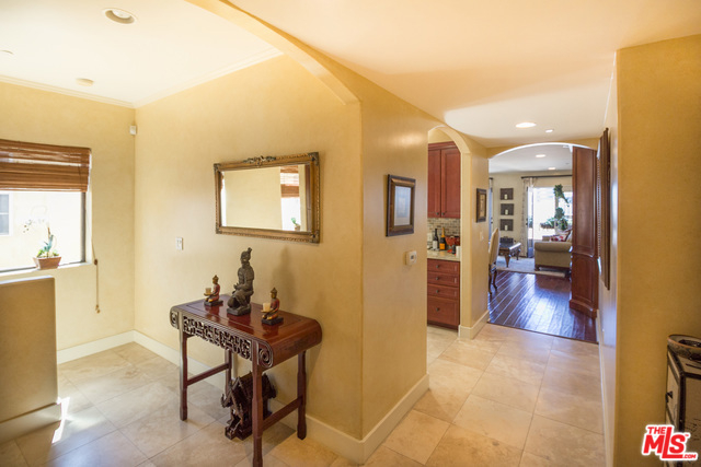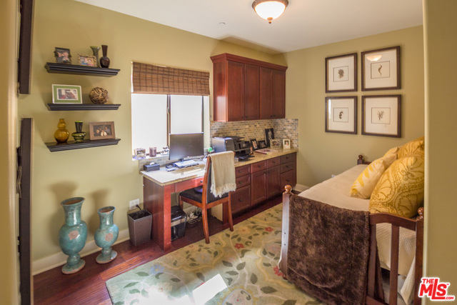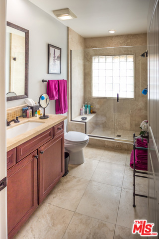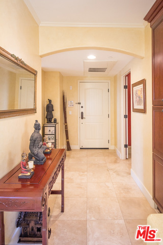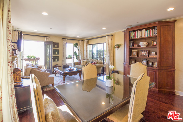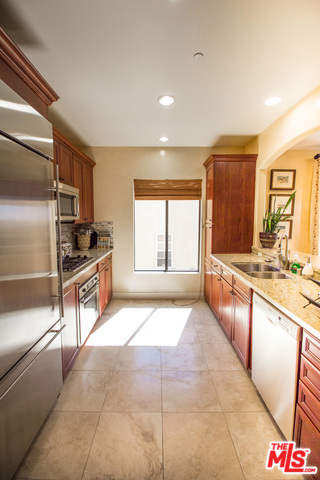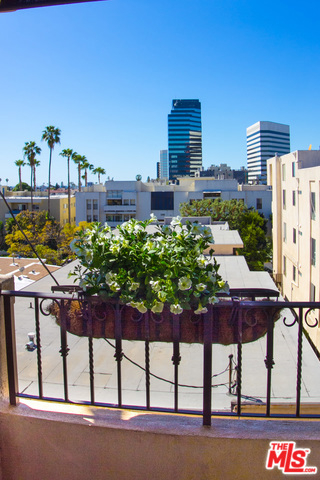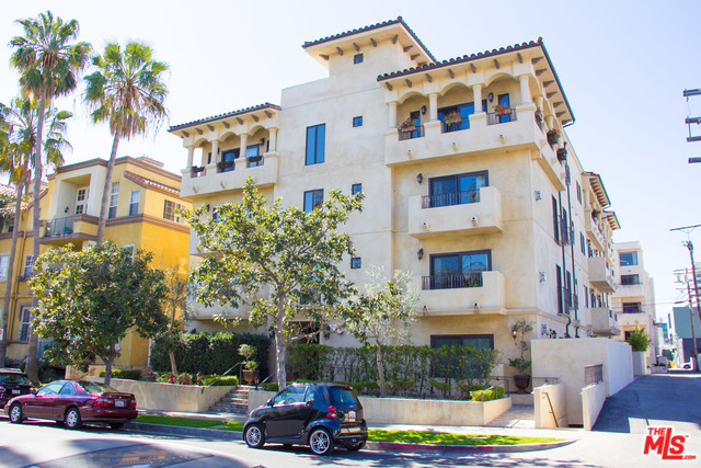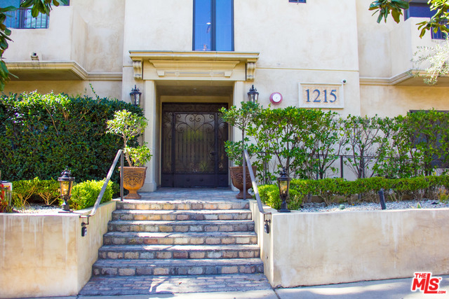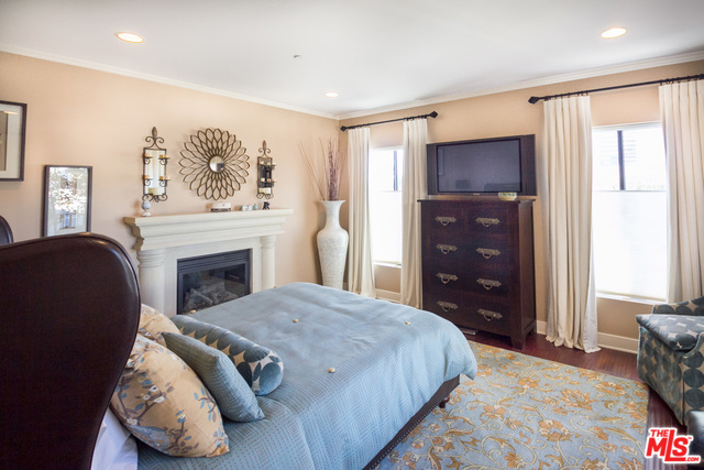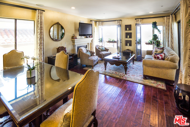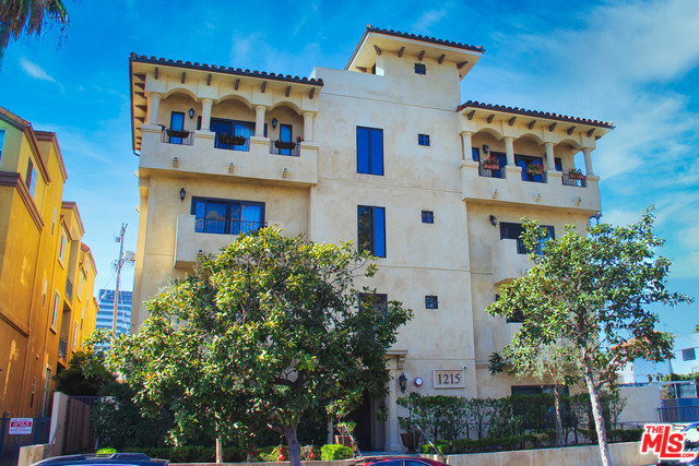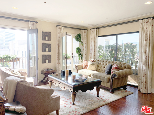Stunning 2 level penthouse on private corner with sweeping 180-degree panoramic view from hills to peek-a-boo ocean view! On tree-lined street, in beautiful Tuscan Mediterranean building built 2008. Full of natural light and decked-out w/ gorgeous distressed hardwood and travertine flooring, recessed lighting, dual-paned windows & glass doors, custom drapery, window coverings and built-in shelving/cabinets throughout. Spacious chef's kitchen featuring breakfast bar, granite counter tops, GE monogram built-in stainless steel refrigerator & Bosch stainless appliances. Open and elegant dining and living room w/ gas fireplace, charming balconies and French doors equipped w/ motorized sunshades. Luxurious master suite w/ full en suite bath, fireplace, large closet and private balcony. Generously-sized second bedroom w/ full en suite bath and large closet/storage area. Laundry closet w/ cabinets and full-sized washer & dryer. 2 premium (non-tandem) parking spaces in subterranean gated garage