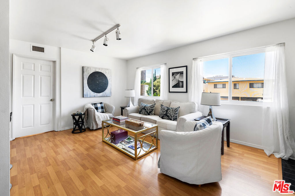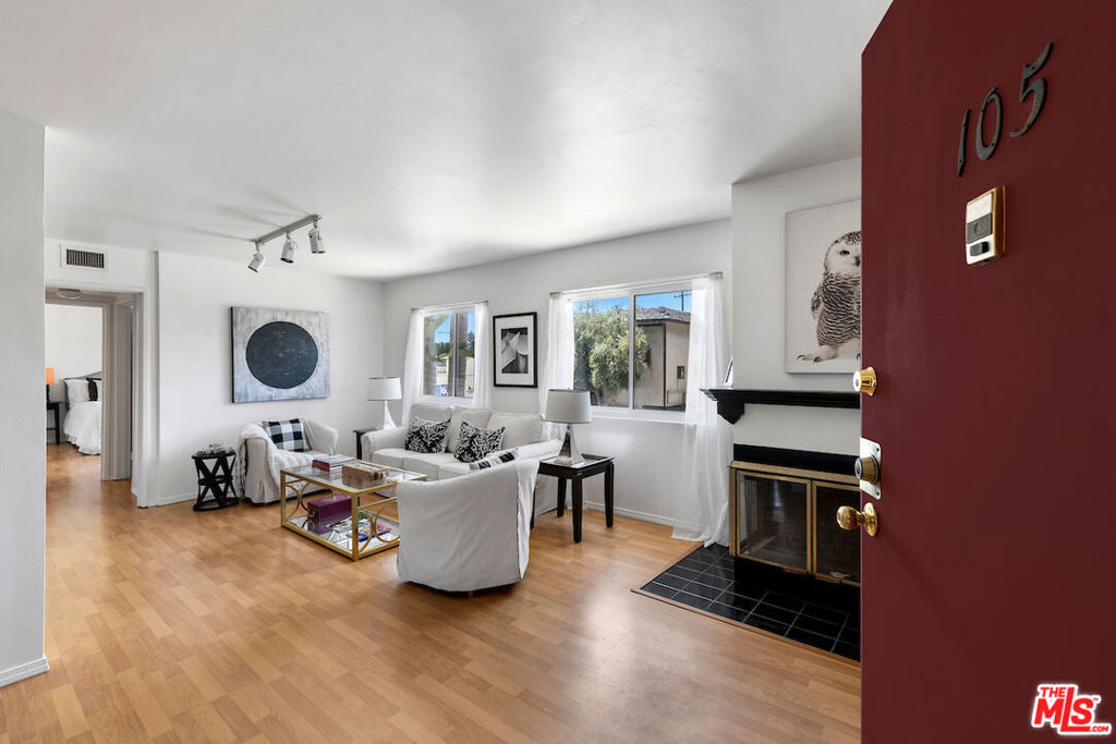 Incredible Value on this Contemporary Condo in West L.A.! Rare condo with an oversize private 2 car garage with outlet and faucet. This Brentwood adjacent unit is front facing Southwest corner with only one common wall. Single level unit above street level. The building also offers guest parking spaces. Laminate floor and double pane windows throughout and a large private patio and balcony. Fireplace in living room, spacious dining area, kitchen with stainless steel appliances, granite countertops with breakfast bar and wine fridge. There is an inside laundry, generous size bedrooms and a master bath with spa tub. This is a pet friendly building and Homeowners dues include water and earthquake insurance. A block to Brentwood and close to UCLA, restaurants, shops and services. Minutes away to Santa Monica, beach, Century City and Beverly Hills.
