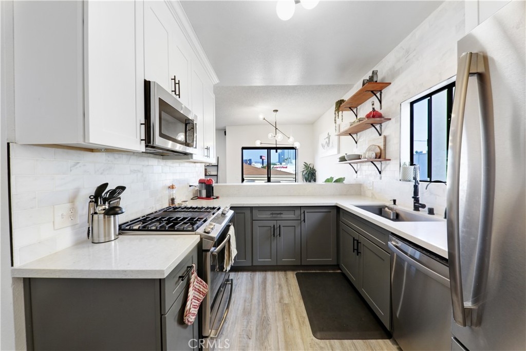 Welcome to this beautiful, open concept, well-lit 2bd/2ba home in a prime Los Angeles location minutes from Santa Monica, Brentwood near all of your favorite shopping and restaurants. Newly upgraded home featuring new SPC vinyl flooring (luxury vinyl that combines limestone and stabilizers to create an extremely durable core--100% waterproof, adds stability, dent resistance and structure) (flooring has extra underlayment for maximum soundproofing), new kitchen appliances, Italian marble backsplash, quartz countertops, newly installed cabinets with slow closing drawers, stainless steel farm sink, with washer and dryer hookups and storage space. Enjoy a meal or cup of coffee in your dining area or on the balcony for some fresh air. Living room is pre-wired with surround sound capability. Complex has a secured entrance, and includes subterranean double tandem parking that sits right next to your (oversized) assigned storage space. HOA includes water, sewer, and earthquake insurance. Don't miss the opportunity to live in this beautiful community and home. (Surround sound speakers, washer and dryer are negotiable) (Paintings not included)