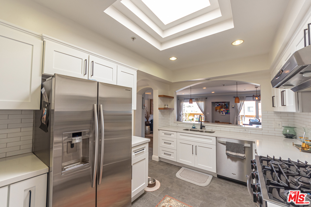 Contemporary top floor, front-facing, corner unit in West LA. Features include recently remodeled open kitchen with stainless steel appliances, French doors open to a large private balcony, skylights throughout provide ample natural light, crown molding, recessed lighting, in-unit washer/dryer and new flooring. Spacious Master suite with vaulted ceilings offers en-suite with dual sinks and generous walk-in closet. Two side-by-side parking spots in gated garage with guest parking. Walk Score of 83. Just minutes from restaurant row in Sawtelle district, retail shopping (including Trader Joes, Target, and coming soon Whole Foods), Metro Expo Line and local dog parks. Easy access to 10 & 405. HOA includes water, trash, EQ insurance and fitness center. Please visit our 3D virtual tour/interactive experience, link in Private Remarks.