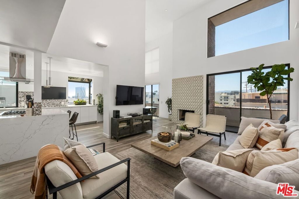 Fabulous one-of-a-kind, totally remodeled 3 bedroom (currently used as 2 + loft)/3 bath incredible Penthouse Contemporary corner-unit condo with huge rooftop patio! Sophisticated with chic stunning designer finishes, soaring ceilings, large windows and large walls for art, and filled with an abundance of natural light and very few common walls. Formal entry leads to spacious open floor plan with 18 ft ceilings, living room with fireplace opening to dining room and 2 balconies with sliding door access. Open dream gourmet kitchen with large center island including breakfast bar, quartz countertops, stainless steel appliances, wine rack, flower box window and contemporary cabinetry. Primary bedroom includes a 2nd gas fireplace and large customized walk-in closet. Beautiful primary bathroom with dual basins, custom tiled walls and open shower with skylight. Spacious 2nd bedroom next to the to updated 2nd 3/4 bathroom. 3rd bedroom (currently light and bright open loft) with closet and ensuite remodeled 3/4 bath and access to a fabulous oversized, open rooftop patio with panoramic view from city skyline to coastline sunsets. Additional features include porcelain wood-like flooring, Central ac/heat, pets ok, community pool/spa and gym, secured 2-tandem covered parking and Earthquake Insurance included in HOA dues. Ideal Westside location, within close proximity to Brentwood's San Vicente Blvd. retail and restaurants, Whole Foods, Trader Joe's, UCLA, Santa Monica beaches and 405 & 10 Fwys. Truly spectacular! Pristine move-in condition.