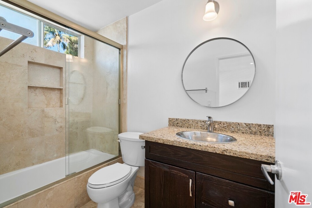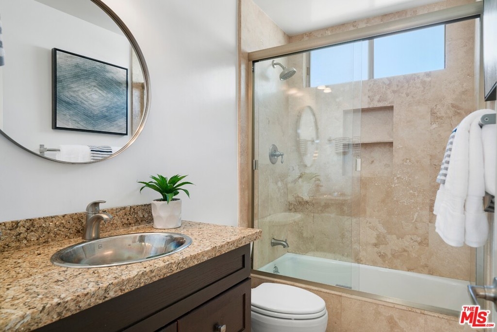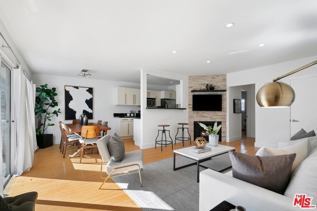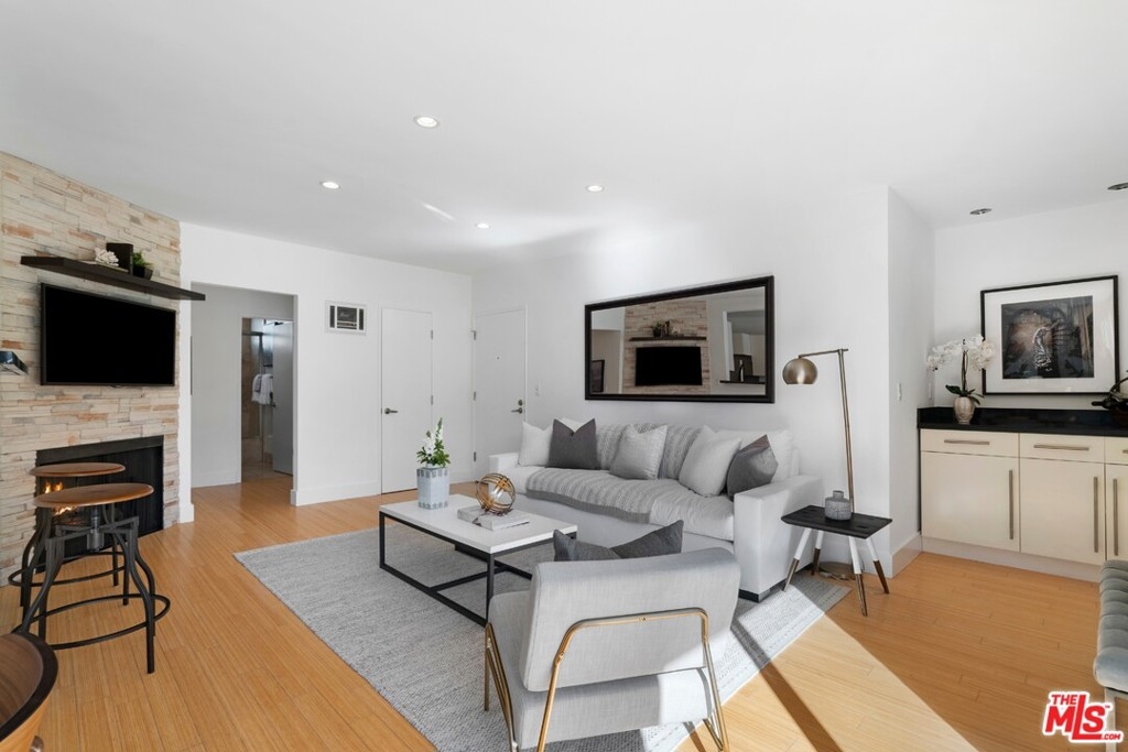 Light and bright 2 bed 2 bath updated condominium at the Granville Villas in the hot Sawtelle district in West Los Angeles. Beautiful open layout with hardwood floors, kitchen pass through bar, dining area, built-in entertaining bar, and spacious living room featuring stacked stone clad gas fireplace with floating shelves. Large balcony with updated deck provides additional light and space. Updated kitchen features generous granite countertops and stainless steel appliances including refrigerator, dishwasher, microwave, and gas range/oven. Updated bathrooms with elegant travertine tiles and granite countertops. Large closets, plantation shutters, and an en-suite bathroom in prime bedroom. Brand new in-unit washer/dryer. Air conditioning and heat. Includes two garage parking spaces and keyed storage space. Great building with lush landscaping and gated front entry. Moments away from Trader Joe's, Starbucks, a flagship YMCA, and the shops and restaurants of Sawtelle's famed Japantown!