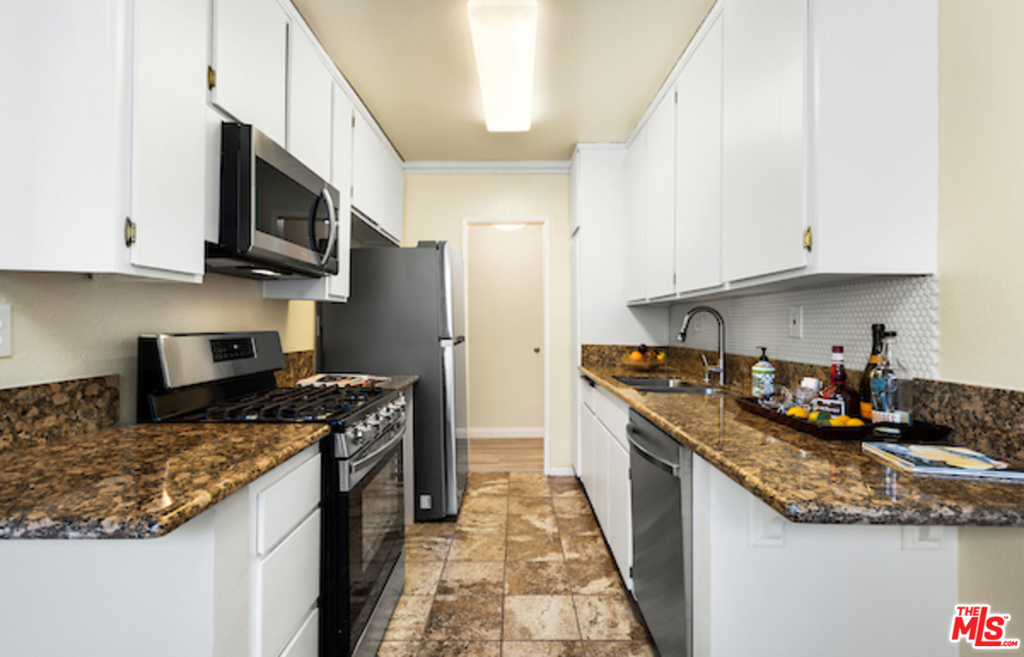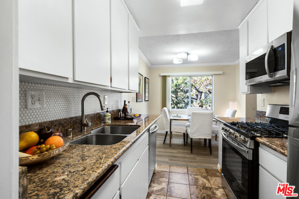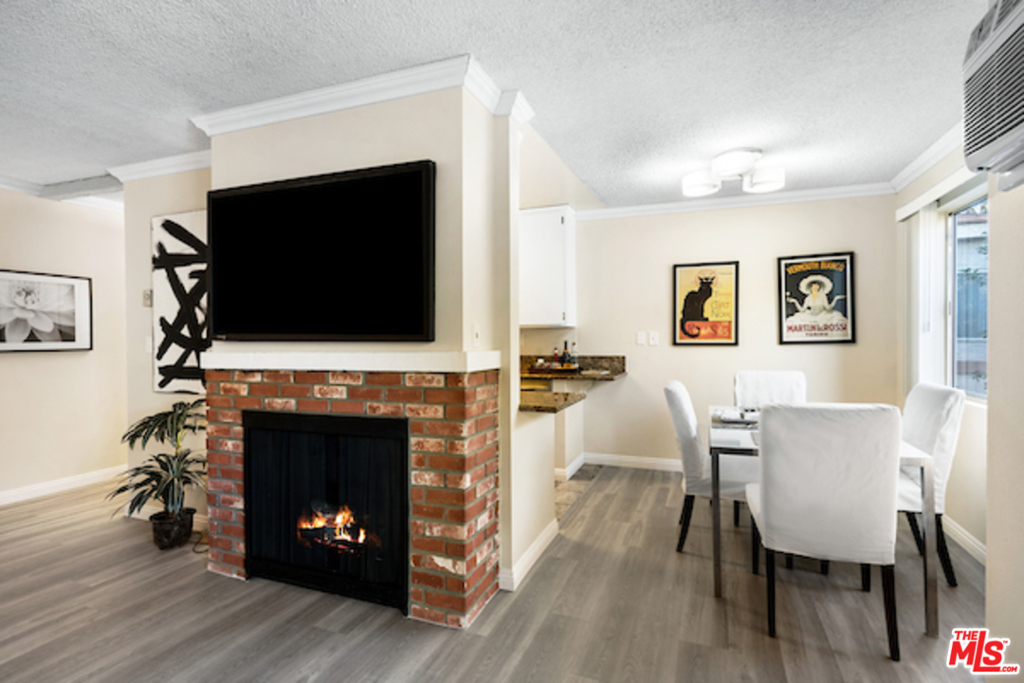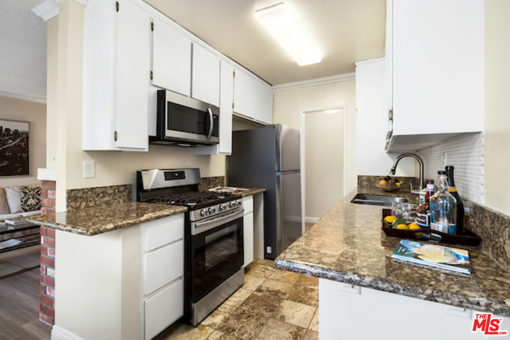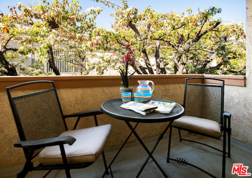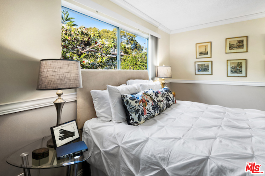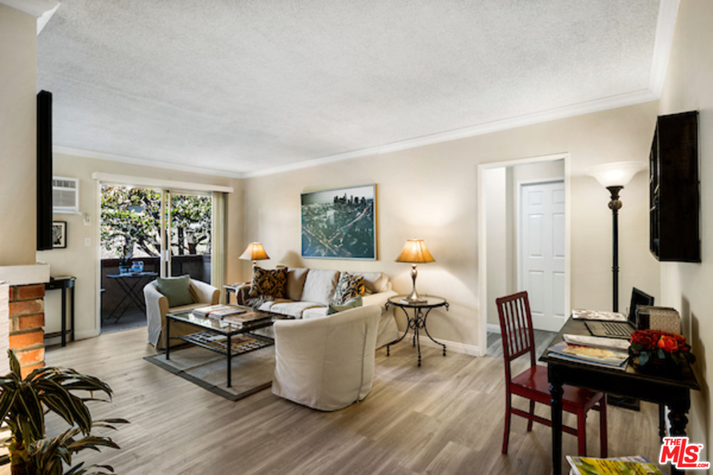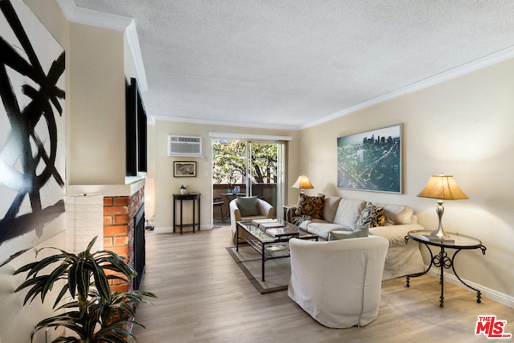 Classic West L.A. Garden Condo Complex. Spacious top floor unit with beautifully laid out new laminate floors throughout. Great greenery views of trees and the lush courtyard landscaping. Formal entryway with great open floor plan. The crown moldings establishes balance and proportion of every room. The living room has a brick fireplace and room for an office desk. Good size private patio, redone tiled kitchen with granite countertops, new stainless steel appliances, separate formal dining area, generous size bedroom with walk-in closet, tastefully done tiled bathroom with granite counter. Ample closet, storage and built-ins, 2 car security parking with storage. The Rochester Regency Condominiums is a well maintained and managed building. Convenient to shops, dining, services, metro station, freeway and to UCLA. The location is Brentwood and Santa Monica adjacent and close proximity to the vibrant Sawtelle Blvd cultural and culinary hub.