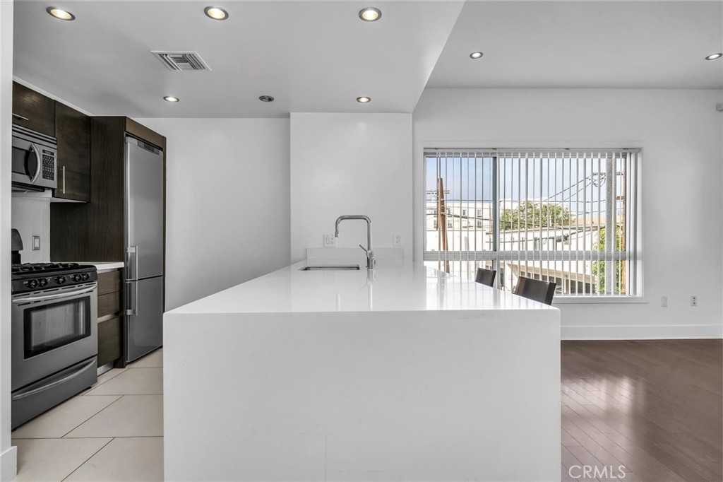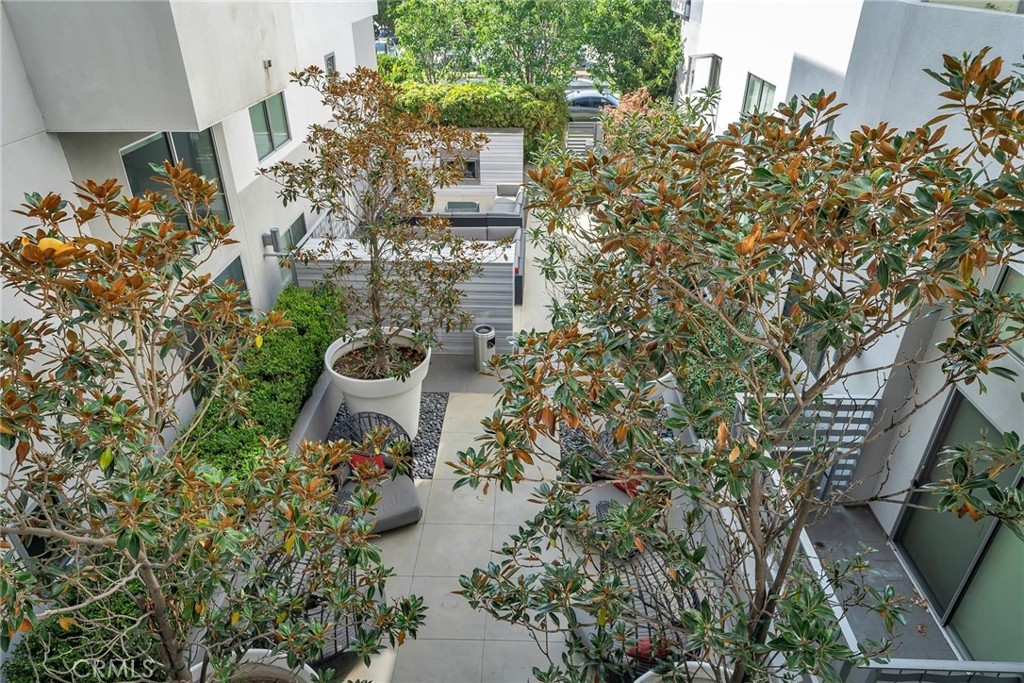 Contemporary condo in the heart of West LA steps from trendy Japantown. Northeast corner/end unit provides privacy and lots of natural light. Wood floor from hallway thru dining & living room. Open kitchen has quartz counters. Large balcony off living and master bedroom. Stackable washer/dryer, central AC, recessed lighting. Two bedrooms are separated for privacy. Two gated parking spaces (not tandem). Common area offers patio lounge with firepits for casual socializing or reading books. Great access to restaurants, shops, UCLA & Santa Monica. Pet-friendly complex allows one dog and one cat (less than 70 lbs - buyer to verify with HOA).