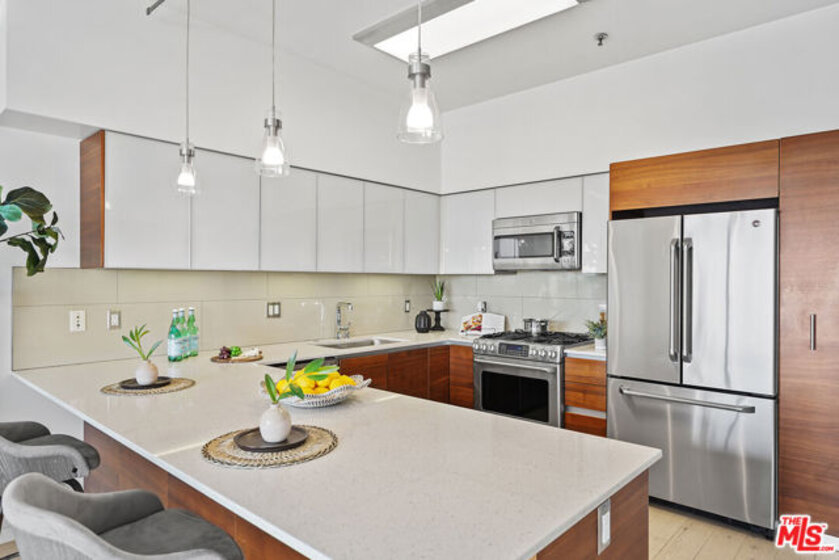 Welcome to the T Lofts, luxury living in West Los Angeles! Designed by Withee Malcolm Architects in 2009, clean lines combined with open style living, create a light and airy space in a serene community. This large one bedroom, top floor, private end unit, with lots of natural light, and only one shared wall, features beautiful porcelain tile floors. A large open living room, with a balcony off the dining area overlooking the city. Open eat in kitchen with stainless steel appliances. Spacious bedroom, with city views, a large closet and private glass sliding doors for a modern touch. Bathroom features double sinks, soaking tub and shower. Other features include: additional storage closet, washer/dryer hookups in unit, central air and heat and two assigned parking spots. The community features secured entry with controlled access, outdoor grills with picnic area, spa, gym, plenty of guest parking and electric car chargers. Located conveniently near Sawtelle District restaurants and shops. Easy access to the Expo Line and centrally located to enjoy all of what Los Angeles has to offer.