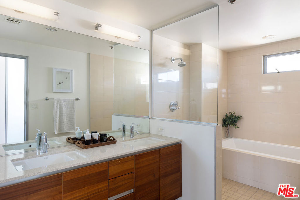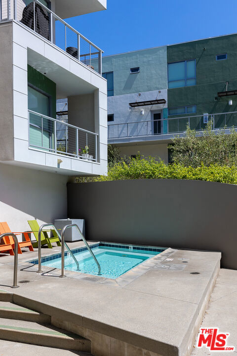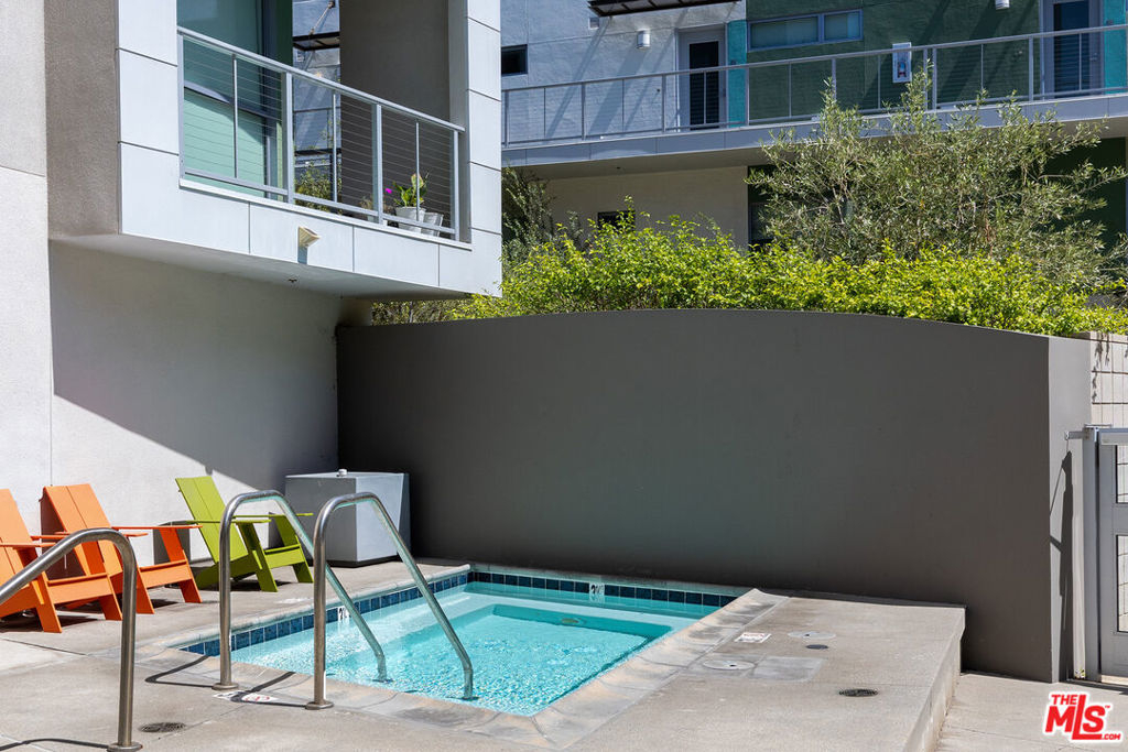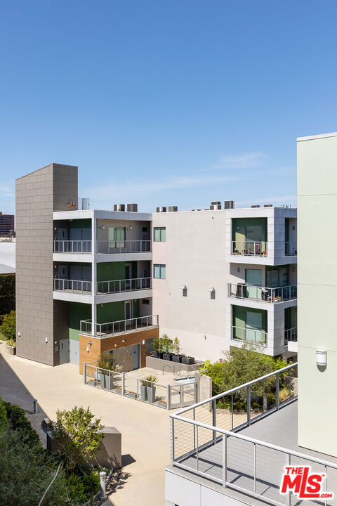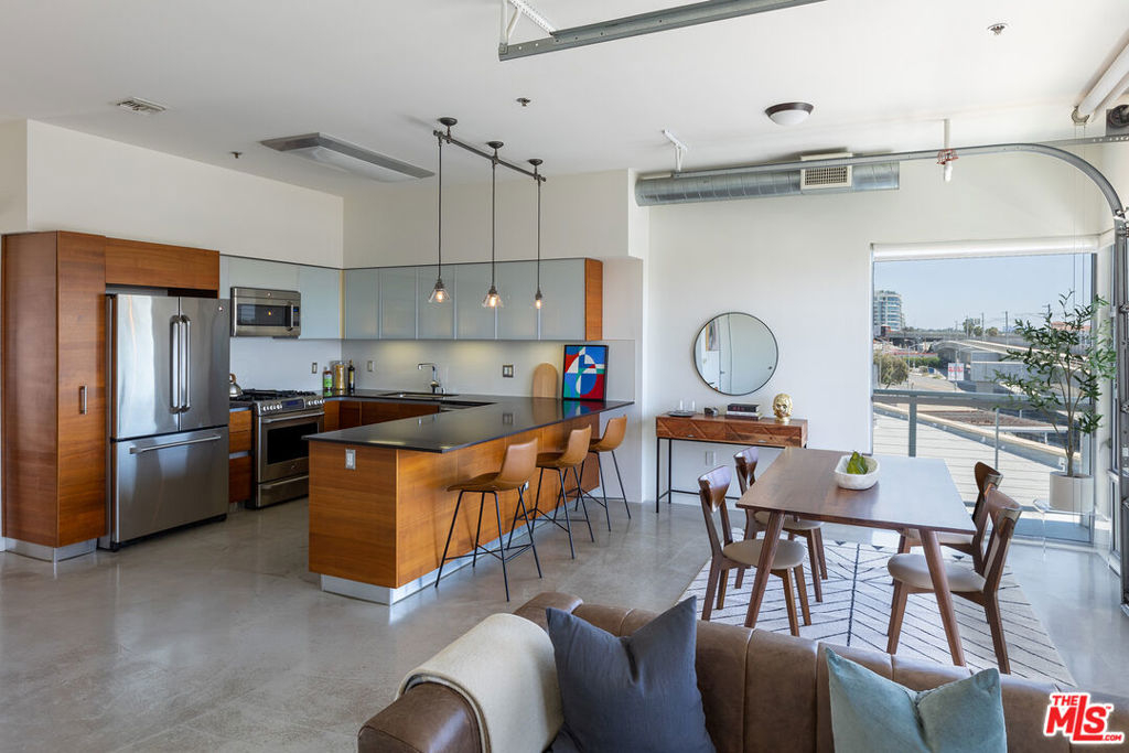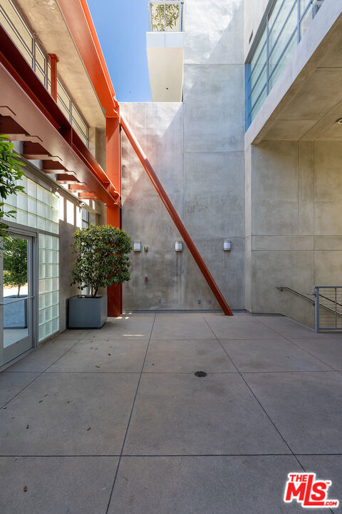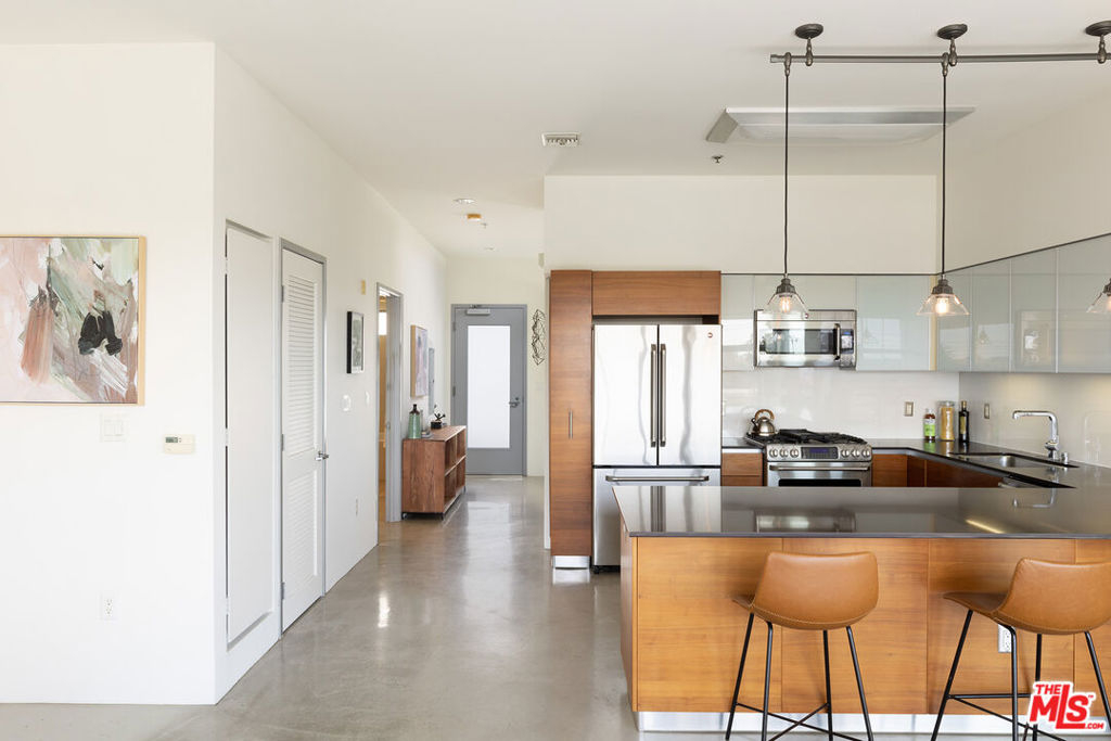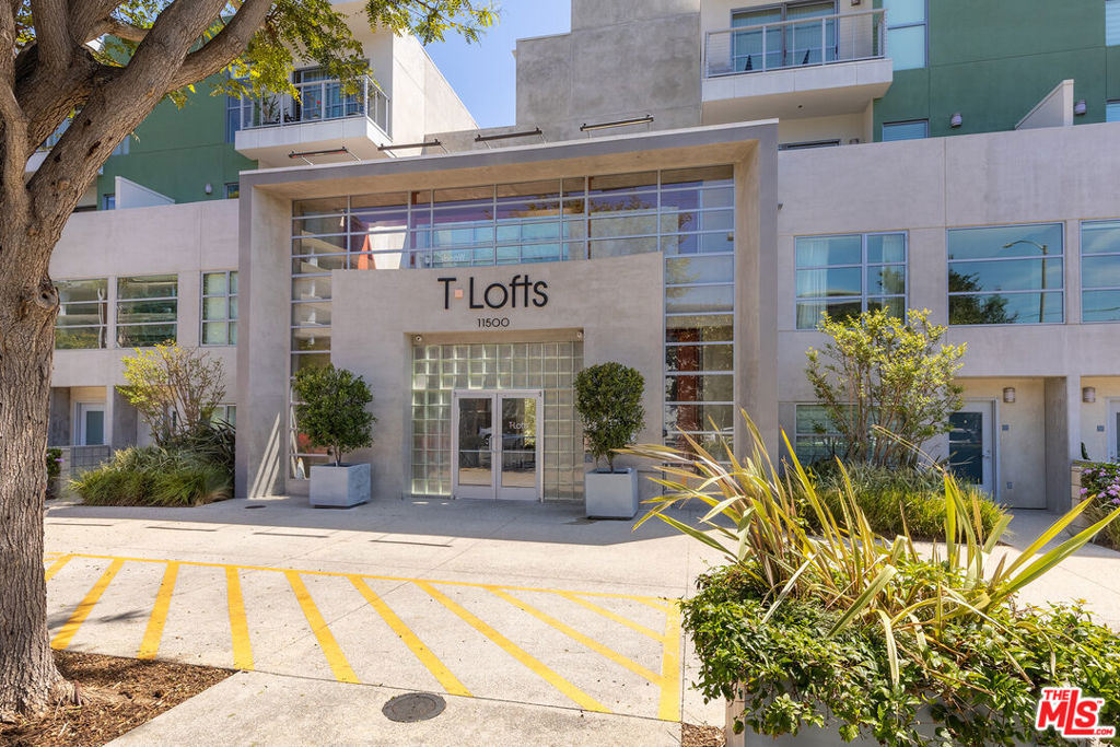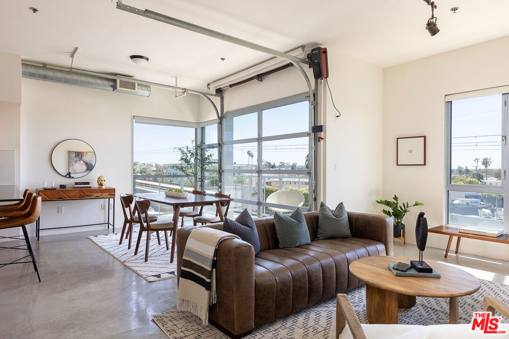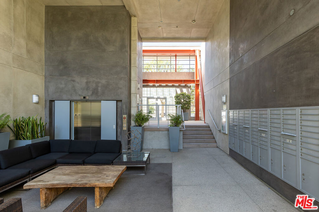 Withee Malcolm Architects | T-Lofts, 2009. While designing the 84-unit T-Lofts building, the architects were focused on an eco-friendly complex while keeping with the urban vibe in a hip, mixed-use location of West Los Angeles. This rare, upper-end unit shares only one common wall. High ceilings, crisp light spaces complimented by polished concrete floors. The loft centers around a massive roll up "fire engine" door and wrap-around balcony with south facing views. Open kitchen with granite counters and stainless steel appliances. Oversized spa-like full bathroom easily accommodates more than one user. Walk, ride or drive to the area's most popular cafes and shops, walking distance to the light rail Expo Line. Ample electric car chargers, pets welcome, extra guest parking. Spa, gym, outdoor grills, dramatic open-air lobby.
