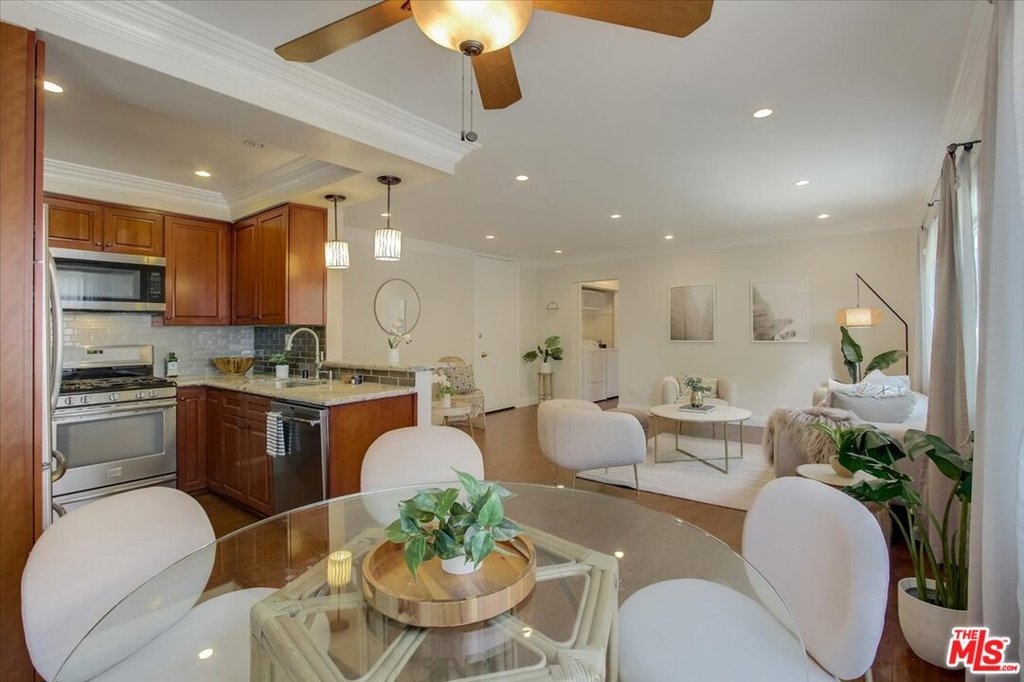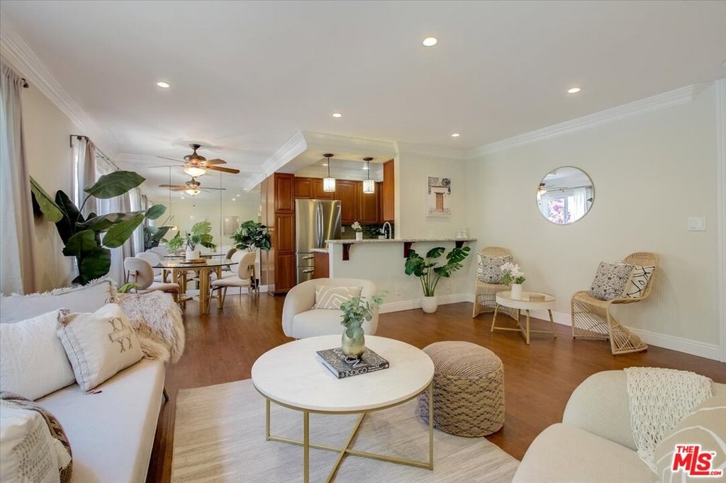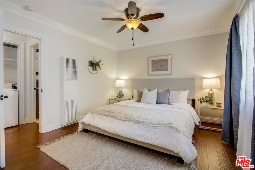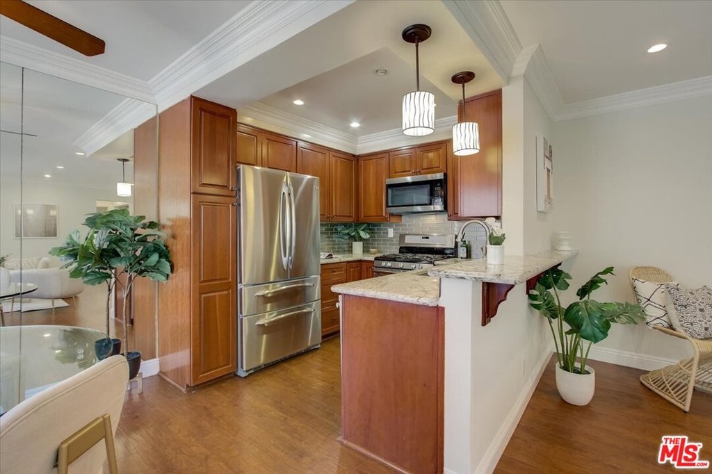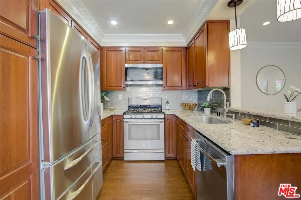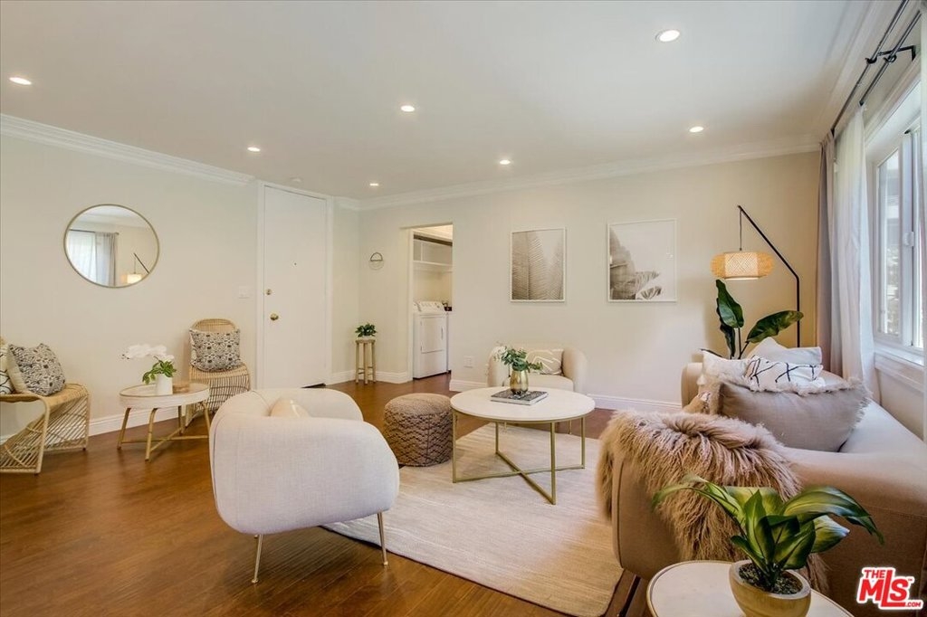 Must see! Chic 1 bedroom 1 full bath condo. Great for 1st time home buyer. Remodeled in 2013 with cherry stained cabinets in kitchen and bathroom, granite countertops, stainless steel appliances, crown moldings, laminate flooring, spa-like bathroom, Large master closet and more. The only unit with a W/D inside. One Parking stall in a gated garage and extra storage in front of the parking stall. Low HOA. Building upgrades: Soon to be freshly painted inside and out. Close to Santa Monica, Brentwood, UCLA, restaurants, beaches, and freeway.