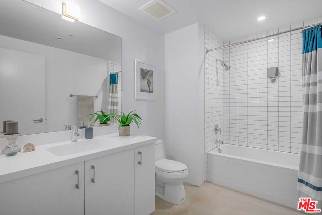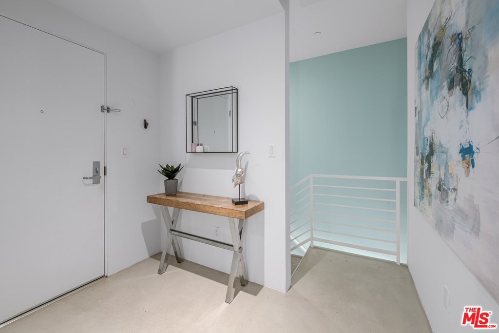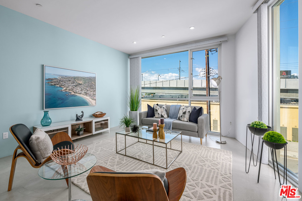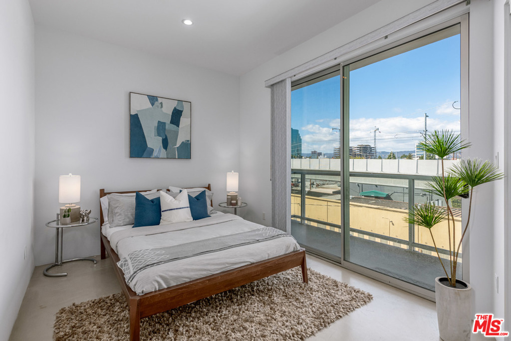 Rare two-story Top Floor contemporary condo in West LA. This open and bright unit is complete with sleek finishes, floor to ceiling windows,10ft+ ceilings and polished concrete floors throughout. Kitchen boasts sleek Caesarstone countertops, modern cabinets as well as stainless steel appliances. The master which is located off the den area gets tons of natural light, and has a great sized balcony. On the bottom floor you have the living room, dining area, and kitchen. Off the kitchen you have a great bonus indoor patio perfect for reading or yoga. The complex is gated and has two parking spots, laundry in the unit, central HVAC, and more.