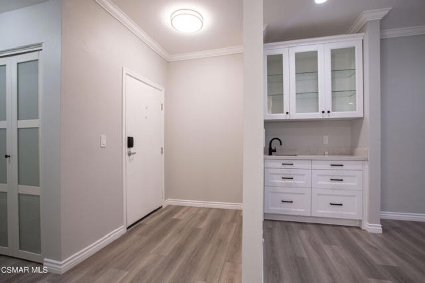 Amazing condo in highly desirable West LA. Next street over are upscale restaurants and shopping. Extremely desirable floor plan that has been completely remodeled. As soon as you walk in, you'll fall in love. This 2 bedroom, 2 bathroom, approximately 1,200 sq ft is loaded with charm and elegance. The kitchen has all new appliances, including refrigerator and microwave. Italian quartz, tile backsplash, lots of counter space and storage for all your pots and pans. Shutters give you privacy or light, when needed. New doors, vinyl flooring throughout, crown molding, laundry and storage in the hallway are obscured with beautiful modern folding doors. Master bedroom has a walk-in closet with built in shelving, both bedrooms are a nice size, ceiling fans, each with its own slider to the outside. The secondary bedroom has a large mirrored closet. The spa like bathrooms are beautiful and equipped with rain shower heads, modern toilets, marble tile & glass shower doors. The living area is equipped with a wet bar and fireplace. A quaint patio area is located at front, with a shady sitting area. Gated entrance for added security, underground parking garage with two spaces, storage area, elevator and lots of charm make this home so enticing. Ideal location and close to everything. Easy access to freeways. Don't let this one get away.