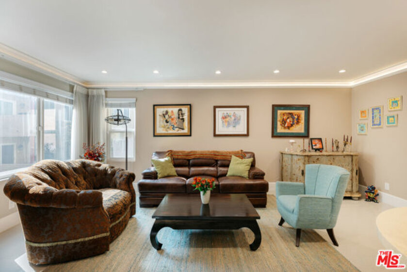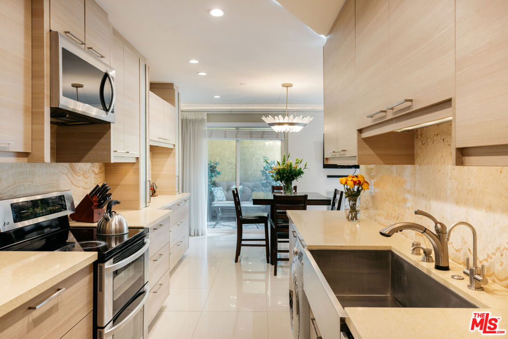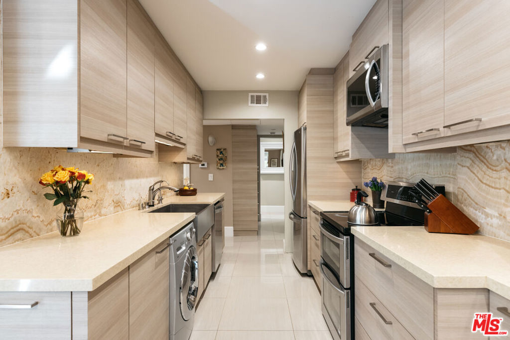 Immaculate and rare corner unit at the Wilshire Barrington with no common walls and private balcony. Meticulously updated featuring large galley kitchen with recessed lighting and ivory marble flooring throughout. Spacious single story home with built-in cabinets and shelving in the living room and dining areas along with ample closet space and additional private storage. Master bedroom has en suite master bathroom with a custom porcelain tiled rain shower and glass enclosure. Second full bathroom has a jacuzzi tub for soaking, and third bathroom is a powder room off the living room. Fully upgraded with double paned windows, central air conditioning and heating, and designer kitchen with oversized single basin sink, LG stainless steel appliance set, quartz countertops with marble backsplash, and in-unit laundry. The unit is elevated above the ground level secured parking garage where there are two dedicated tandem parking spots. The building is well maintained and features a pool, gym, sauna, and courtyards. Close walking distance to Brentwood, Wilshire Blvd, and Santa Monica Blvd in the best part of West LA.