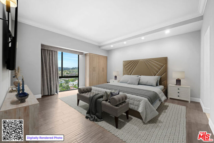 Pleased to present our newest listing at The Grand, a prestigious full-service building offering valet service, a pool, gym, and a recreation room with kitchen. This generous rear-facing unit features two bedrooms and two bathrooms, tastefully redesigned with wood floors and stunning views throughout. The bright, all-white kitchen is outfitted with high-quality appliances and clean, timeless finishes. The spacious primary suite boasts gorgeous views, a beautifully remodeled bath with dual sinks and a double rain shower. The secondary bathroom features a raised soaking tub. The second bedroom opens to a large private balcony, perfect for relaxing or entertaining. Additional highlights include side-by-side parking. This is a rarely available, ideally positioned back unit in one of the most sought-after buildings along the prestigious Wilshire Corridor. Don't miss this exceptional opportunity.