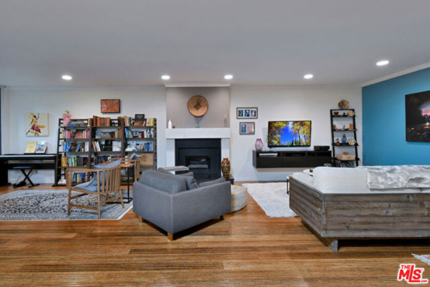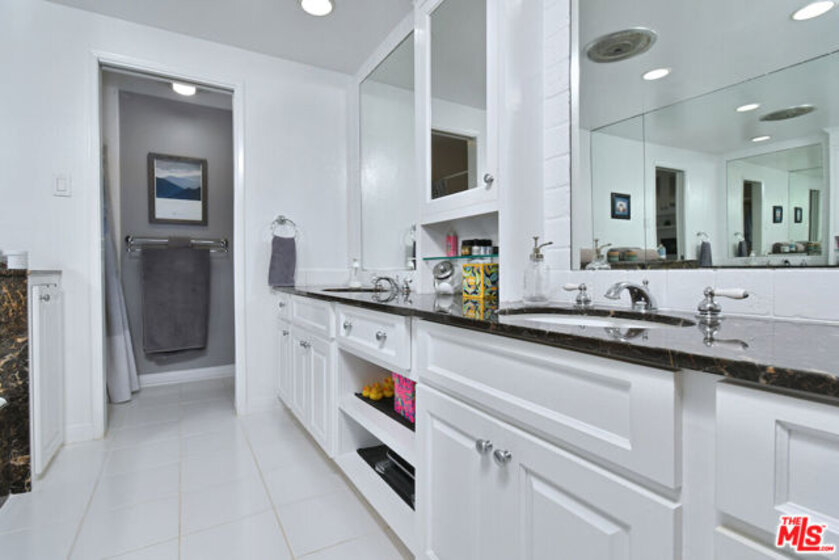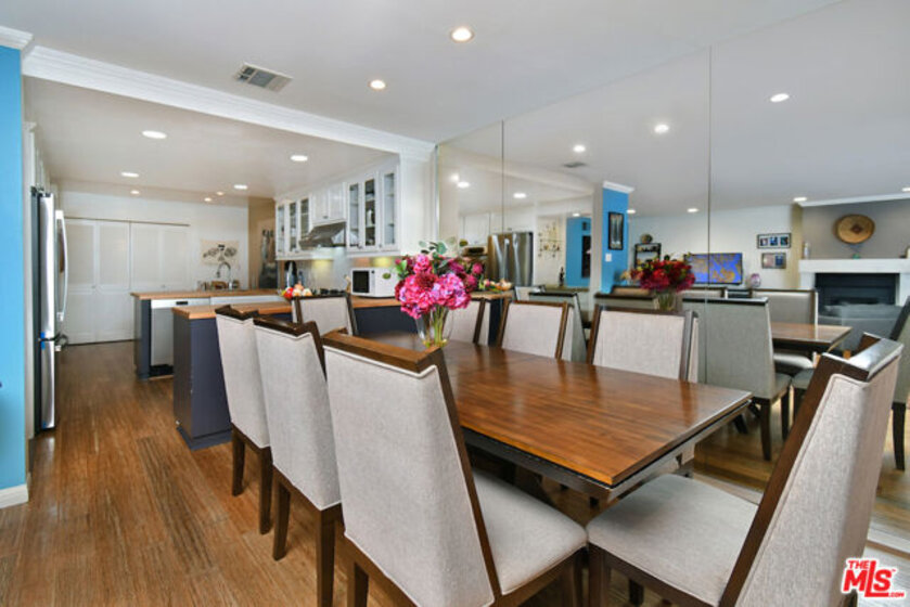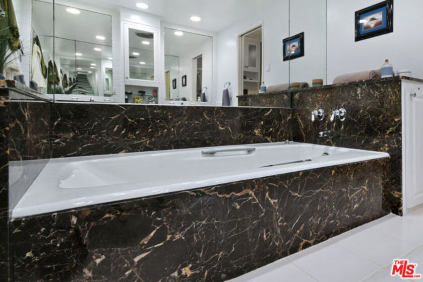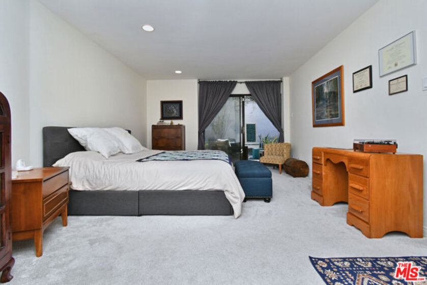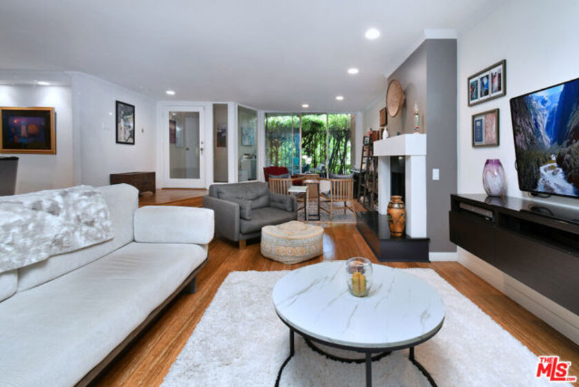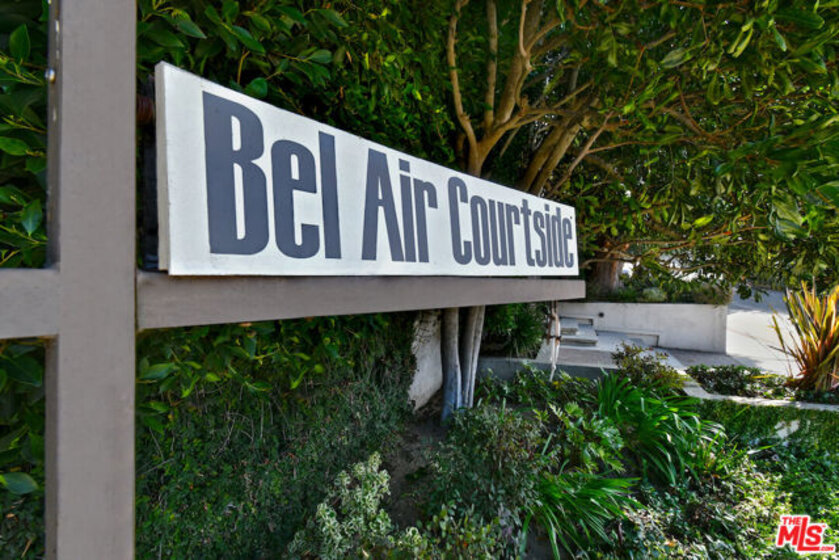 Welcome to Bel Air Courtside Condominiums, an exclusive 16-unit building surrounded by greenery and offering beautifully landscaped grounds, a swimming pool, and a rooftop tennis court. Private patio courtyard entry opens to the front porch and patio. From the courtyard, a glass front door leads into the inviting living space with multiple sitting areas, a mantled fireplace, hardwood floors, wet bar, and sliding glass doors to the front patio. The kitchen includes a breakfast area, glass front cabinets, pantry, and opens to the formal dining room. Thoughtful floor plan to enjoy everyday living or entertaining guests. There are two en-suite bedrooms, including the primary bedroom with a walk-in closet and spacious bathroom featuring double sinks, a large soaking tub, and separate shower. Both bedrooms have glass doors that open to a large backyard patio and garden with a fountain. Additional features include great storage space and extra closets throughout, indoor washer and dryer area, and a guest half bathroom. Elevator or stairs lead to side-by-side parking spots with a personal EV charger. A unique place to call home in a great Bel Air/Brentwood location near the Getty Museum. Easy access to everything!