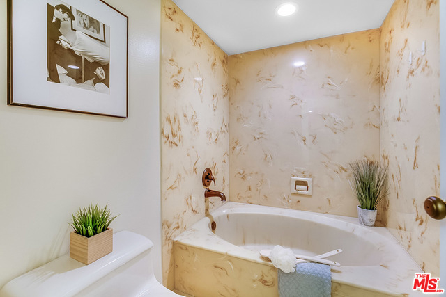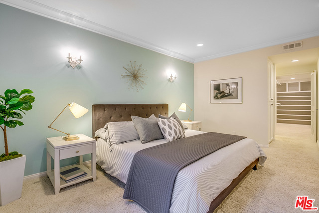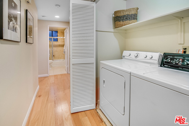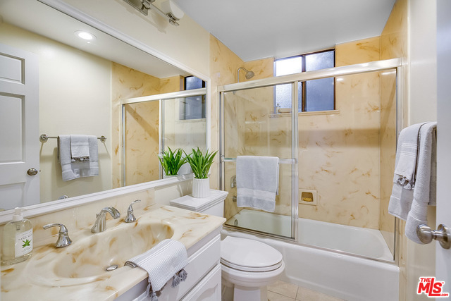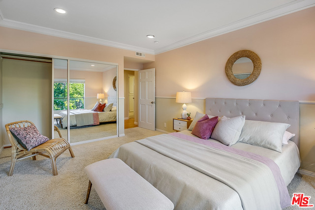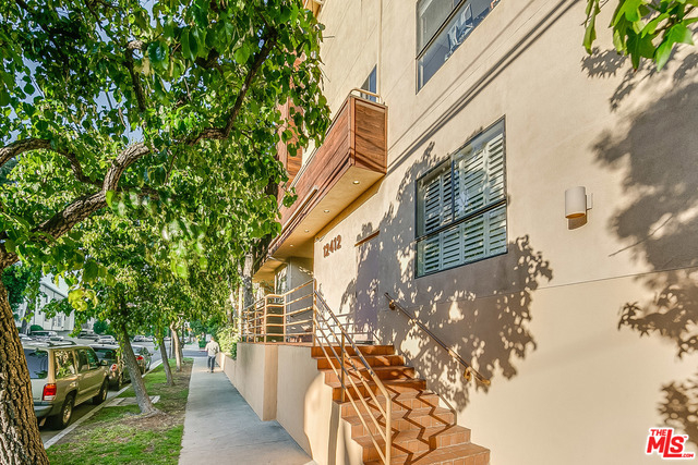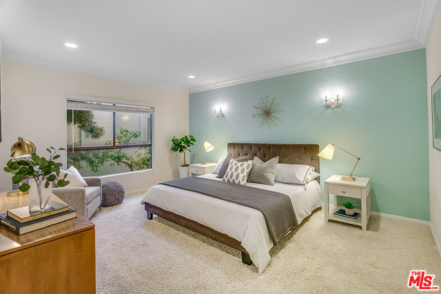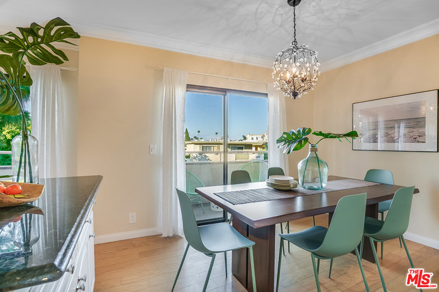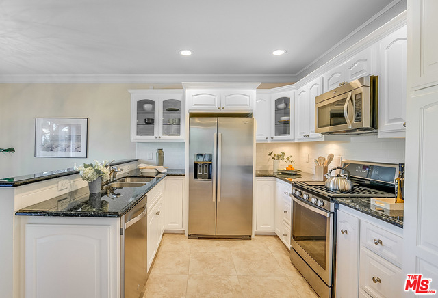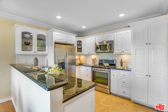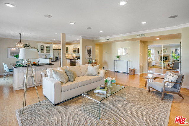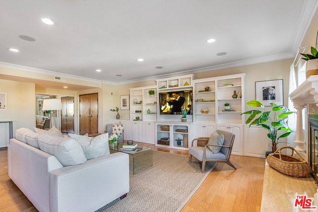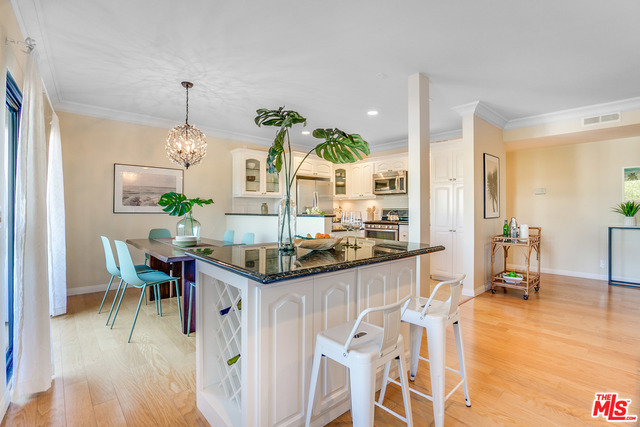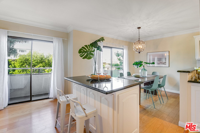 Abundant light streams throughout this stunning single level home. Completely remodeled kitchen perfectly situated for entertaining in this open concept floor plan. Stainless appliances, granite counter-tops, custom soft close cabinetry, and adorable island to gather round for food and fun or gather round the table in the dining room that opens up to a balcony with tree top views. Cozy up to the fireplace in living area with expansive built-ins to house all your media needs, also a book lovers dream. Recessed ceiling speakers add extra drama to high ceilings with crown molding. A luxuriously large en-suite master awaits with walk-in closet. Generous carpeted second bedroom has full bath. Laminate Hardwood floors, central A/C and heat, in unit washer/dryer, controlled access building and gated garage with parking for two. Walking distance to Bristol Farms/ Starbucks and many shops and restaurants, minutes to Santa Monica Beach.