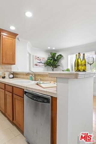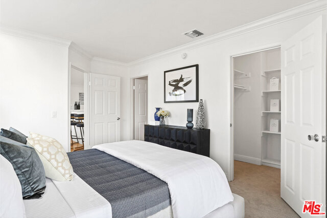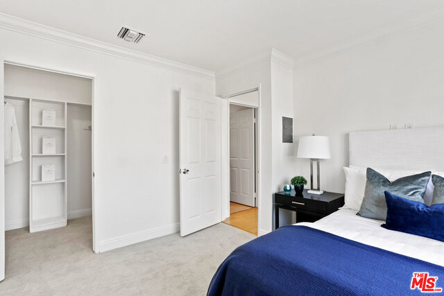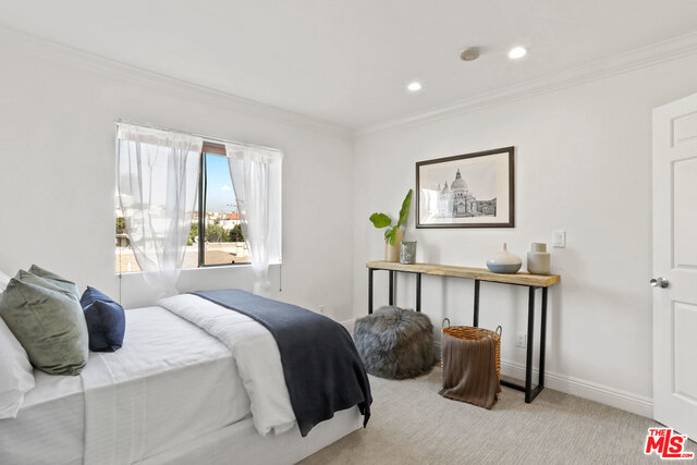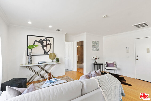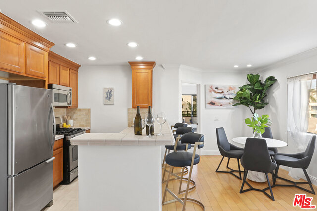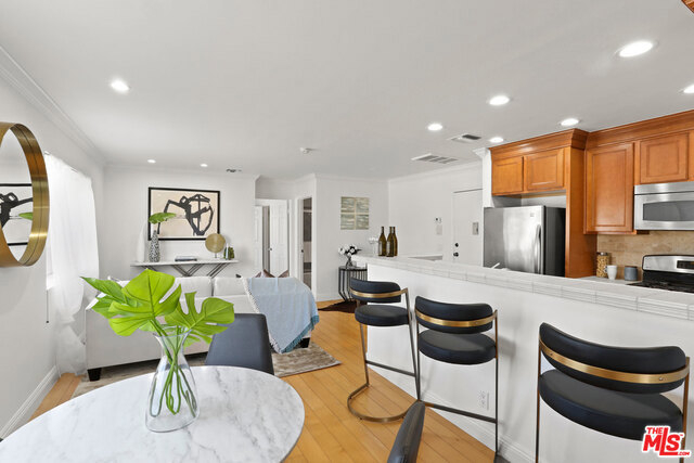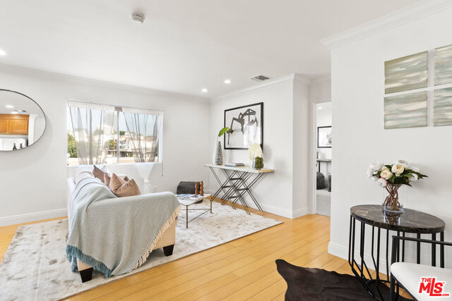 Adorable top floor front facing 2 bed 2 bath condo in small 8 unit building. Open kitchen with, tile counters and backsplash and stainless steel appliances. Wood floors in living areas. Crown moldings. New paint, carpets and recessed lights. Good closet space. gated parking. Low HOA dues. Great starter home.
