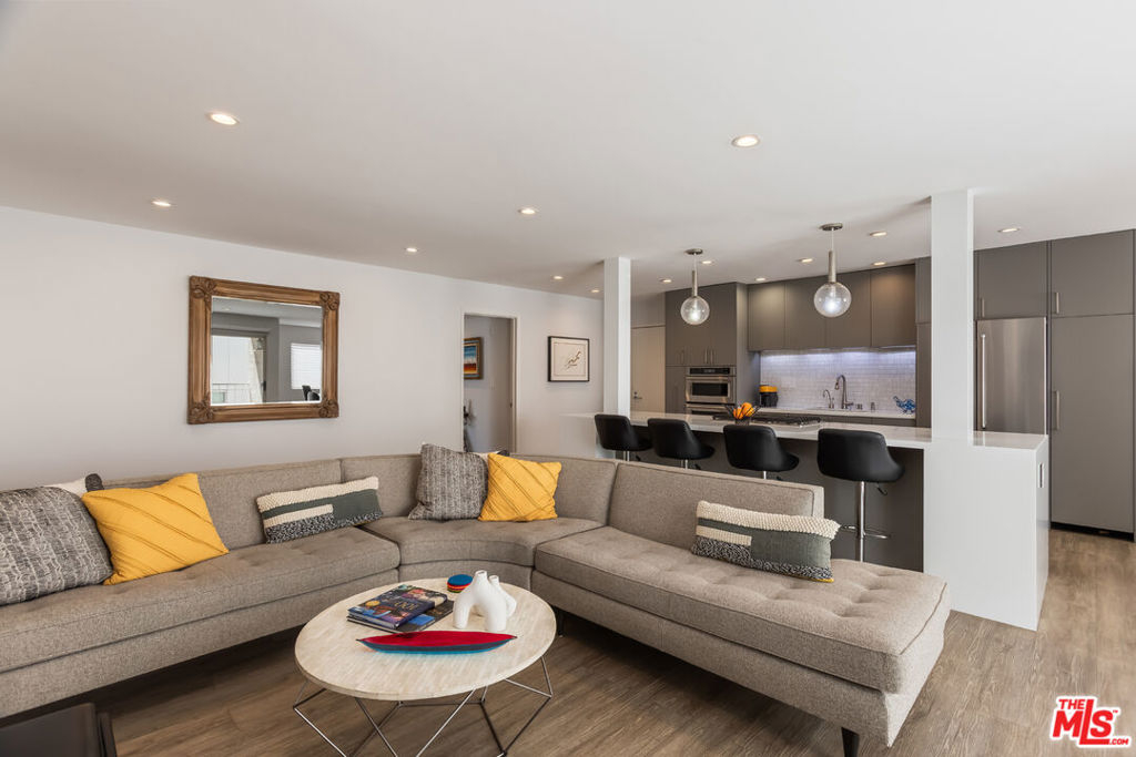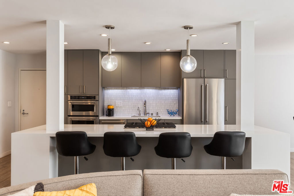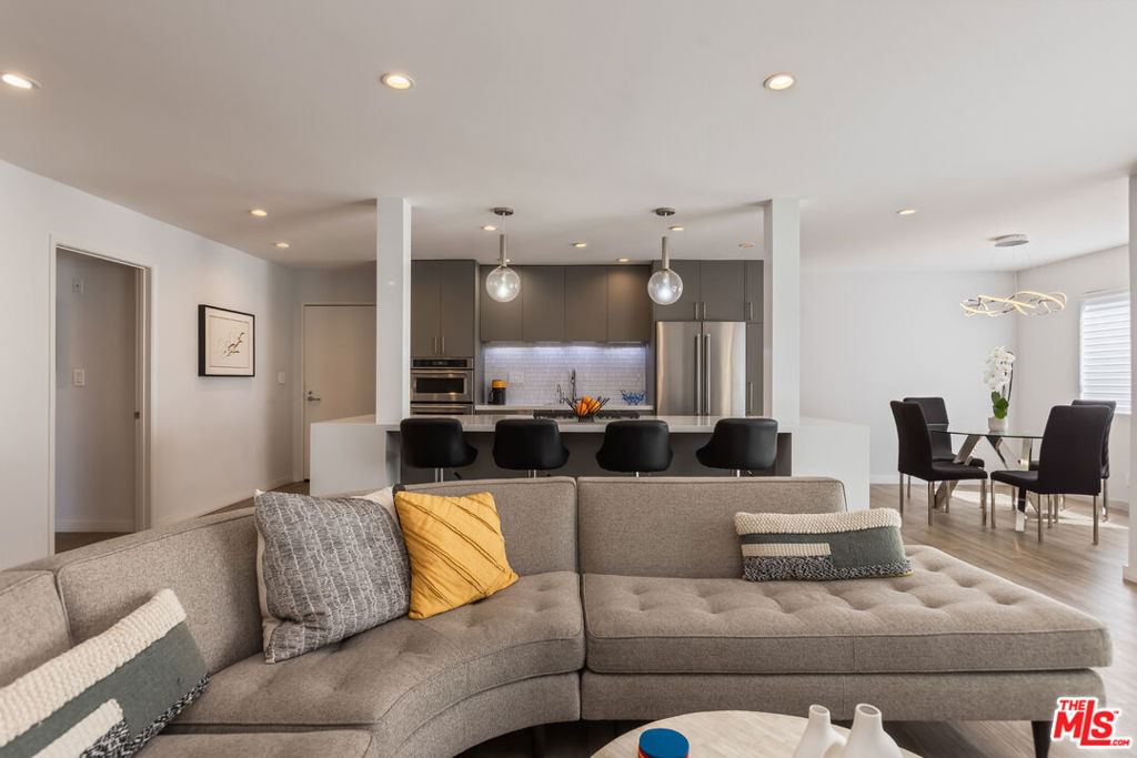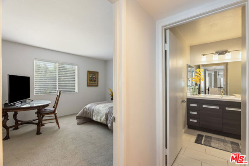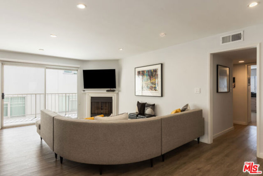 Chic, updated, single-level, top floor, private, corner unit condo with serene treetop views. The Westwood Bentley is an intimate 14-unit building on a charming tree lined street. This "done" light filled, 3 bedroom, 3 bath bright residence offers a rare opportunity to own a perfectly designed layout with a calm, zen-like feeling with no neighbors on either side. The beautifully renovated kitchen is a focal point and a cooks dream, featuring a striking waterfall island, soft close cabinetry with pull outs, Legrand pop up outlets and a premium KitchenAid appliance suite. The open concept flows seamlessly into the living and dining area ideal for both entertaining and everyday living-while a private balcony provides the perfect spot for a morning cup of ambition. Additional highlights include, recessed lighting, Hunter Douglas Silhouette coverings, vinyl plank flooring in the main living areas, dual pane windows, Central HVAC system, ample closet space, a gas fireplace and carpeting in the bedrooms. All bathrooms and kitchen were remodeled in 2021. The first bedroom offers privacy with its own en suite with full bath and separate entry, perfect for guests or extended family. Down the hall, a spacious second bedroom (currently used as a home office with built in dual desks) sits adjacent to another bath. The Primary suite is tucked in the rear and features a walk in closet and a beautifully updated full bath. The building is ADA compliant, has controlled access gated garage parking and a convenient storage closet located on the same floor as the unit. Enjoy an unbeatable location with a high walk score just minutes away from shopping and dining nearby. A short drive to UCLA, Sawtelle, Westfield Century City, Westwood and Brentwood Village, Bristol Farms, Trader Joe's and the Beach with easy freeway access. This is Westside living at it's best.