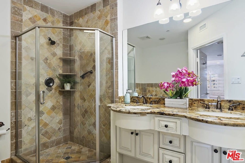 This light, bright and updated Mediterranean corner unit is complete with 3 bedrooms, 2.5 bathrooms and beautiful courtyard entry. Well appointed open living and dining rooms with high ceilings and tons of natural light. Kitchen has stone tile floors, granite countertops, custom cabinetry and top quality appliances. The kitchen gracefully opens into the living area and a separate dining area. Powder room for guests. Large master suite with walk in closet and secondary closet. Master bath has dual vanities and jetted tub. Private open air balcony off of the living room. Gated single-level garage parking with 2 tandem parking spaces and guest parking. Elevator access from the garage directly to the third floor. Lush landscaped community area for relaxing, barbecue and entertaining. In unit washer and dryer. Close to Westwood Village, Beverly Hills, Century City, Brentwood and Santa Monica.