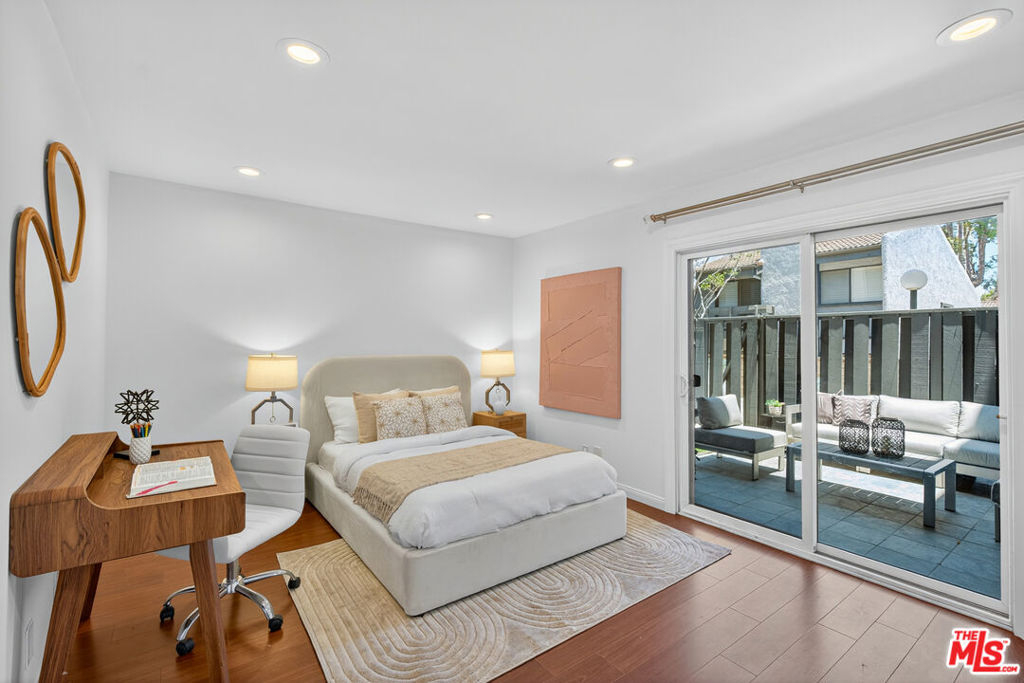 Welcome to this beautifully 2-bedroom, 2.5-bath reverse-floorplan townhome, tucked away on a peaceful, tree-lined street in the heart of Westwood.The upper level features a sun-drenched, expansive living room with soaring ceilings and a classic marble fireplaceperfect for cozy evenings. Adjacent to the formal dining area is a built-in wet bar, and sliding glass doors open to a generous balcony, ideal for outdoor dining or simply relaxing in the quiet surroundings.The chef's kitchen is a standout with custom tilework, stainless steel appliances, ample cabinetry, and a built-in desk alongside a convenient in-unit laundry area.Downstairs, the spacious primary suite offers two walk-in closets, a charming window seat, and a luxurious en-suite bath with granite countertops and travertine flooring. The second bedroom enjoys direct access to a large private patioperfect for morning coffee or evening relaxation.Additional highlights include two side-by-side parking spaces, plenty of guest parking, and access to a well-maintained community spa.Located just minutes from Century City, Beverly Hills, Westfield Mall, and UCLA, and within short distance to top-rated Westwood Charter Elementary and local restaurants. Don't miss this rare opportunity to own in one of West LA's most sought-after neighborhoods!