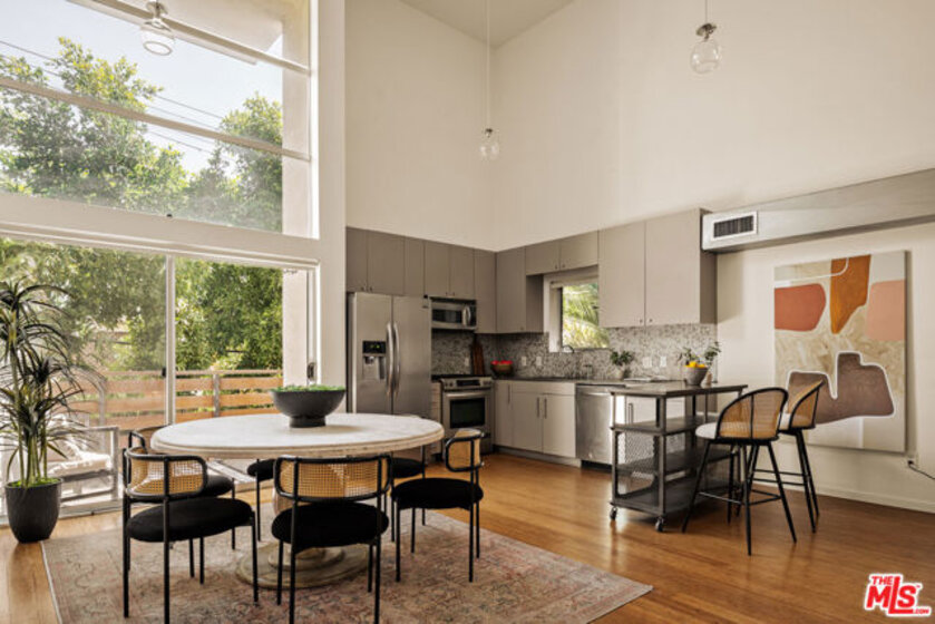 Residing in one of Los Angeles' most centrally located neighborhoods, this creative architectural loft is accentuated by an open-concept, contemporary design. Nestled in a prime back corner spot in the building - away from the street and high above ground level - this residence delivers as a serene, private, and secure retreat. Bamboo hardwood floors, soaring ceilings, and oversized windows create a juxtaposition of warmth against exposed industrial ducting. Anchoring the living area, the well-appointed kitchen and dining space flow seamlessly out to an oversized balcony, perfect for entertaining. Upstairs, a large mezzanine-style bedroom features windows overlooking the main level, offering a sense of openness while maintaining separation. On the main level, a second bedroom provides the ideal space for a home office, creative studio, or additional sleeping quarters. With two modern bathrooms, ample storage, and an in-unit washer and dryer, this space offers both form and function. Beyond the unit, enjoy sweeping views from the shared rooftop terrace - a hidden gem ideal for lounging, entertaining, or watching the city come to life. Parking is never an issue with two assigned garage spots in addition to multiple guest spaces. All of this, just moments from some of the most iconic restaurants, theaters, nightlife, and studios.