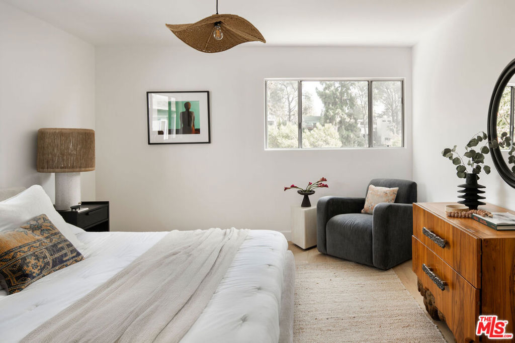 Bathed in natural light with views of tree tops and Bellevue Park, this upstairs rear unit captures the effortless, creative spirit of Silver Lake. With its own private entrance and staircase, it feels tucked away yet just moments from the vibrant pulse of Sunset Junction. Upon entry the open floor plan includes two spacious bedrooms and tasteful updates throughout such as butcher-block counters, stainless-steel cabinetry, new bathroom vanities, new lighting, fresh paint and new engineered-wood floors. This warm and inviting atmosphere leaves room for the next owner to make it their own. Below the unit, a private laundry room adds everyday convenience along with two parking spots. In the evenings, stroll with your dog to the park or meet friends for dinner at neighborhood favorites like Bacari, Pine & Crane or Night + Market Song. The vibe is relaxed, stylish, and unmistakably Silver Lake where community, creativity, and comfort blend effortlessly.